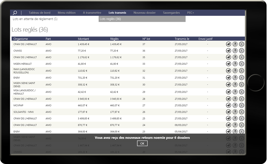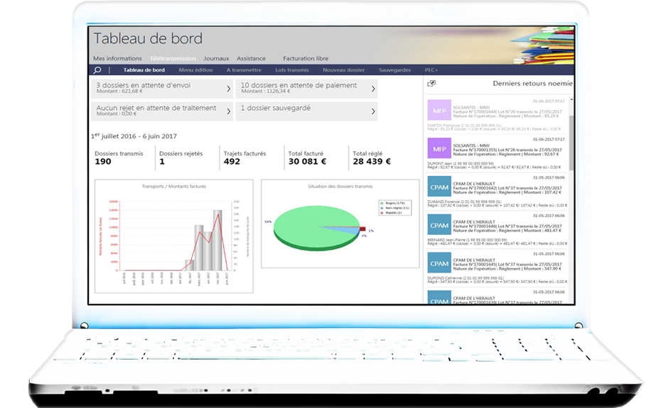 Votre gestion au quotidien devient simplissime grâce au pointage automatique de vos paiements, à l'accès direct à vos dossiers, vos rejets, vos patients, vos retours noemie...
